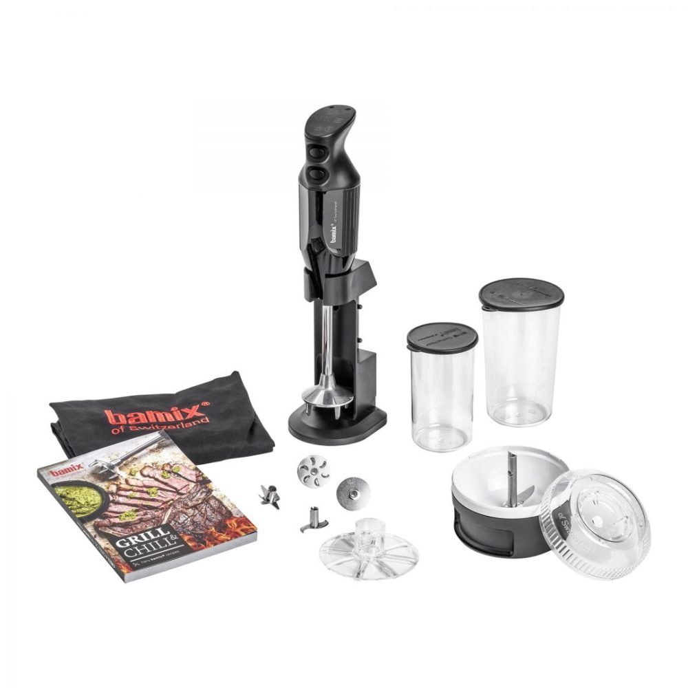 De Bamix® all black, met het vermogen van 200 watt, is het meest complete model. Van rauwe groenten en smoothies tot cakebeslag en pizzadeeg. De bamix® pureert, klopt en mixt met gemak allerlei ingrediënten. In de bijgeleverde processormolen kunt u pesto’s en tapenades bereiden, maar ook allerlei ingrediënten fijnmalen zoals babyvoeding, specerijen, noten, koffiebonen, kazen, … Alle onderdelen die met voedsel in contact komen, zijn van superieure kwaliteit; ze zijn geschikt voor voedingswaren, zijn roestvrij en nemen geen smaak of geur op.